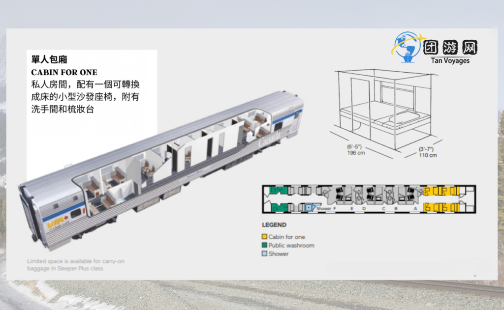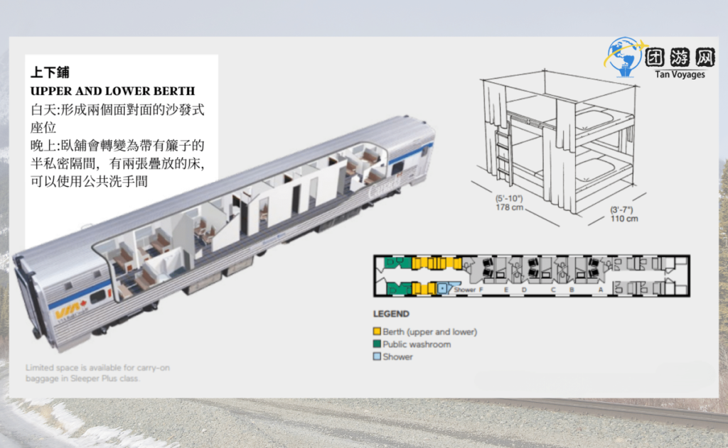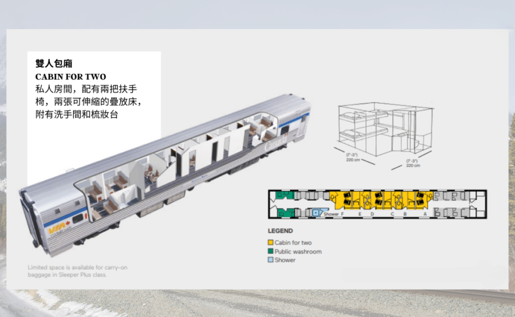 【加拿大】落基山VIA加拿大国铁火车之旅 在加拿大,坐火车是一种与飞机和巴士不同的旅游方式,可以让游客全年都能欣赏到不同的景色。如果想在温哥华和落基山地区度过一个更盡兴的假期,以下加拿大国铁火车路线是连结不列颠哥伦比亚省和阿尔伯塔省的最佳旅游选择。从起点温哥华出發,途经贾斯伯或班芙,然后再转乘巴士,这一整段行程将让游客一路从温哥华坐到多伦多,总长超过4000公里。 搭乘VIA Rail (加拿大国铁),有分"卧舖"以及"经济座位",每一节车厢内有"3种"卧铺选项 1. 上下铺UPPER AND LOWER BERTH 这种”上下舖”座位在白天通常是两个对向的座位,座位旁边有储物柜可以放置个人随身行李。座位宽度等于普通的双人座位。每节车厢共有六个睡眠位(三个上铺和三个下舖)。在晚上当您前往享用晚餐时,车上的服务人员会将座位调整為上下舖的形式,让您享受舒适的睡眠空间。当您准备睡觉时,可以拉上帘子,享受您的私人空间。厕所和淋浴间是独立且共用的,每个车厢共用一个。 2. 单人包厢 CABIN FOR ONE 每节车厢有四间”单人包厢”,房间内有独立的马桶.洗脸台镜子,白天的时候房间里是座位,晚餐时间服务人员会将座位摊成一张床,马桶跟座位则被覆盖在床下,每间包厢都有可以锁起来的门,淋浴间是在外面共用的。 3. 双人包厢 CABIN FOR TWO 每节车厢提供A至F共六间双人包厢,每间包厢内的独立卫生间配备卫生纸。洗手台和镜子与床位设于同一空间内。白天时,包厢内提供两张座位,晚餐时服务人员会准备好上下舖。每间包厢都配有可上锁的门。当一家四口选择两间包厢时,若需要更大的空间,服务人员可以拆除相邻的两个”A”和”B”包厢之间的隔板,以增加灵活性。淋浴间则是共用设施,位于包厢外部。 ***所有卧铺的客人都可以前往景观车厢坐,但是座位有限,先到先得 所有卧舖车厢的乘客都享有包餐服务。如果您选择从温哥华到贾斯伯的行程,晚餐(17:00-19:00)和早餐将包含在服务中。餐点為套餐形式,提供大约4种选择供客人挑选,以西餐為主。為了确保能够享用晚餐,您需要提前预订。一旦乘客上车,服务人员会与您安排用餐的具体时间。 经济型座位 这种座位相比于飞机和巴士来說更宽敞,椅子可向后倾斜,还配有可抬起腿部的靠脚垫。然而,座位价格不包括餐食和淋浴间设备,并且无法进入圆顶景观车厢。但是,列车上提供简餐供应,价格相对经济合理。不同座位类型的价格各不相同,特别是在暑假期间,提前预订价格更合适。 从温哥华出發前往贾斯伯的火车在下午3点出發,第二天早上11点抵达贾斯伯镇(每周有两到三班火车,具体根据季节而定)。从贾斯伯镇出發返回温哥华的火车在早上9:30出發,第二天早上8:00抵达温哥华市中心火车站。贾斯伯附近有一座名為罗伯森山(Mt. Robson)的山峰,是加拿大的最高峰,海拔3954米,还有一个被称為金字塔瀑布(Pyramid Fall)的瀑布,是沿途最著名的景点之一,快到达时会有广播提醒。在加拿大的铁路系统中,货运列车享有优先通行权。如果遇到会车情况,客运列车必须让货运列车先行,这也是火车不准时的原因之一。此外,火车上没有提供无线网络(Wi-Fi)服务,手机信号大部分时间也很弱。乘坐火车就是為了享受放松的旅程,远離现代网络的环境。列车上设有餐车和交谊室,您可以观看影片、社交交流或欣赏风景,时间会很快过去。这一切都等著您亲自来体验!